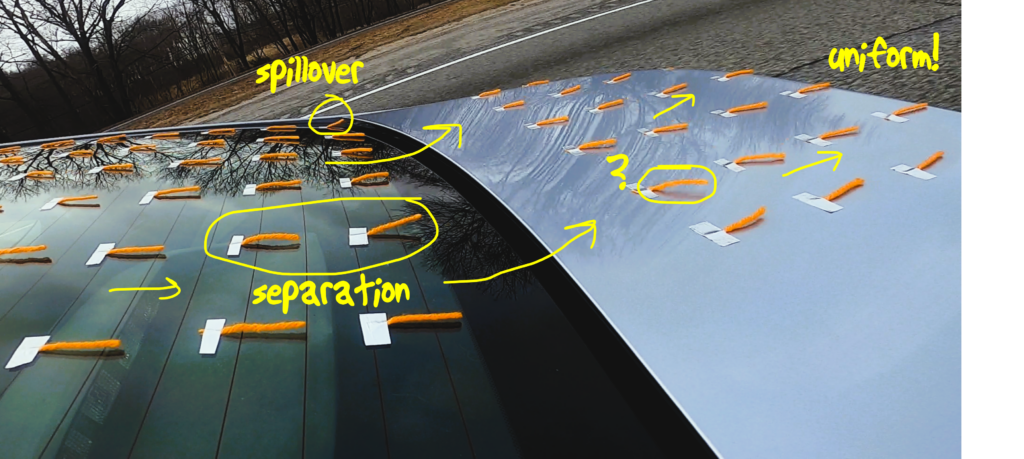 I put tufts on my car and drove… a reasonable speed… to determine the best z-height of a race car wing. Can you spot the location?