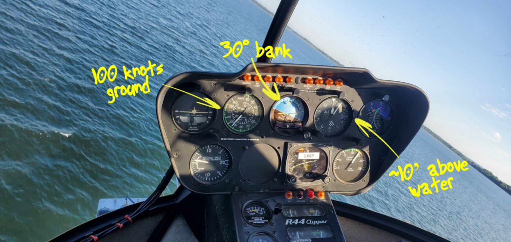 You can see our instrumented helicopter going >100 kts at <50′ with >20° bank over water!